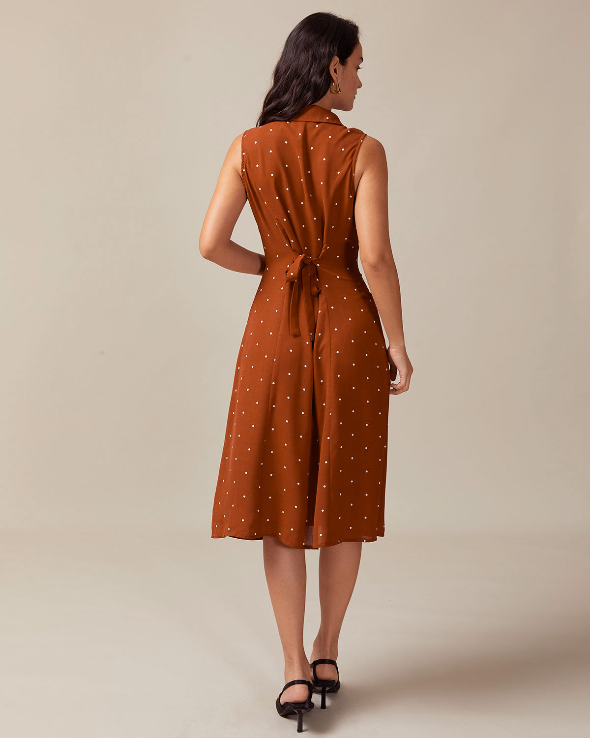 Kahverengi Puantiyeli Kolsuz Midi Elbise