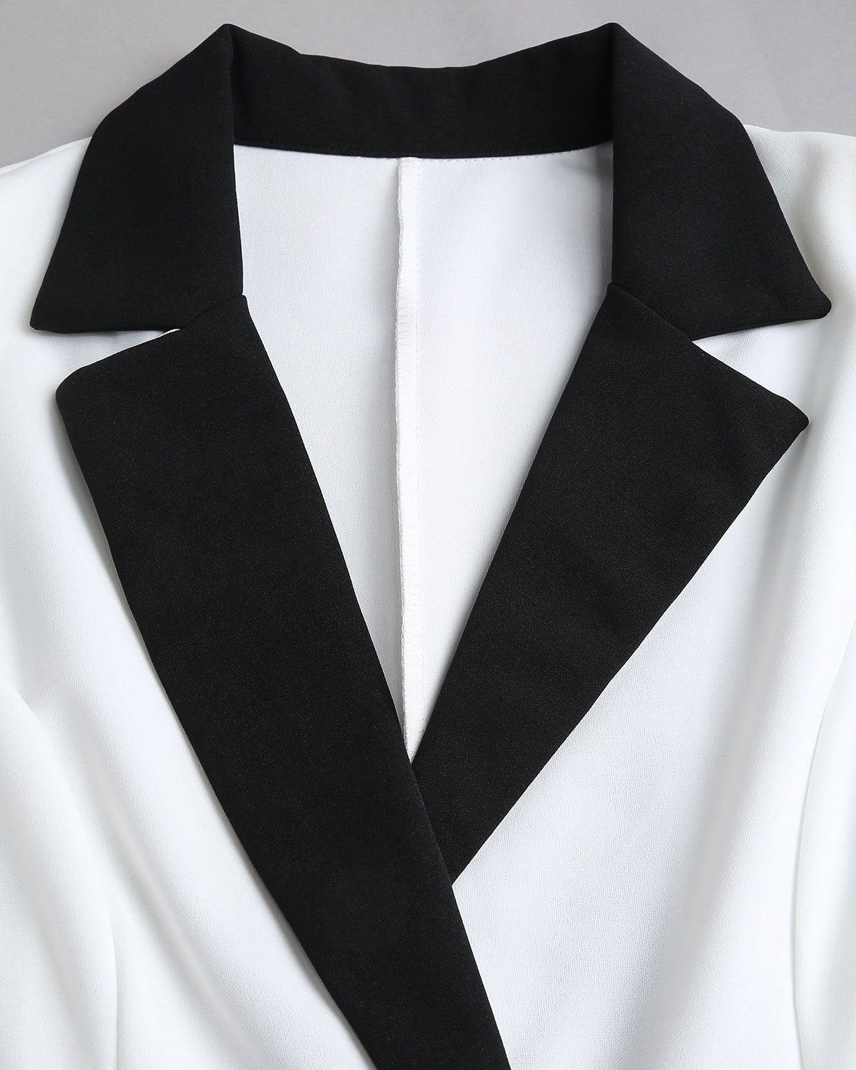 Beyaz Kontrast V Yaka Düğmeli Midi Elbise