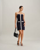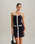 Mavi Sırtı Açık Kolsuz Cepli Örme Mini Elbise