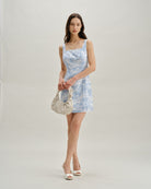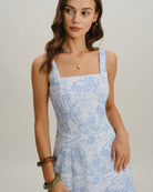 Mavi Çiçekli Kare Yaka A Kesim Mini Elbise