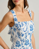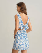 Mavi Çiçekli Bağcıklı Mini Elbise