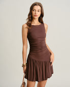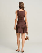 Kahverengi Tekne Yakalı Büzgülü Kolsuz Mini Elbise
