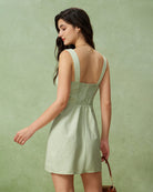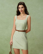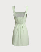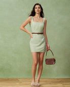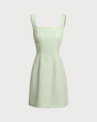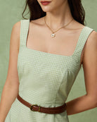 Gösterişli kare yakası ve şık slip silüetiyle bu mini elbise hem eğlenceli hem de şıktır. Yeşil ekose deseni, vintage esintili bir hava katarken, ayarlanabilir askıları mükemmel uyumu sağlar.