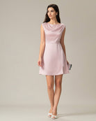 İpeksi satenden üretilen bu elbise, köprücük kemiğinizi vurgulayan zarif bir tekne yakaya sahipken, vücudu saran silüeti ve mini boyu eğlenceli bir hava katar. Kokteyl partileri, buluşma geceleri veya özel günler için mükemmel olan bu elbisenin yumuşak pembe tonu, kadınsı bir çekicilik yayar.