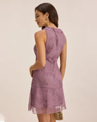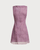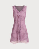 Mor Çiçekli V Yaka Volanlı Kolsuz Mini Elbise
