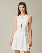 Beyaz Halter Sırtsız Mini Elbisemizle cazibenizi artırın. Şık halter yakası ve cesur açık sırtıyla bu elbise, sıcak havalarda geçirilen geceler ve yaz partileri için mükemmeldir. Hoş mini boyu ve canlı beyaz tonu, onu her durum için göz alıcı bir seçim haline getiriyor.