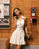 Beyaz Büzgülü Askılı Sırtı Açık Mini Elbise