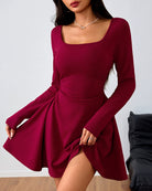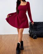 Şarap Kırmızısı Kare Yaka A Kesim Mini Elbise