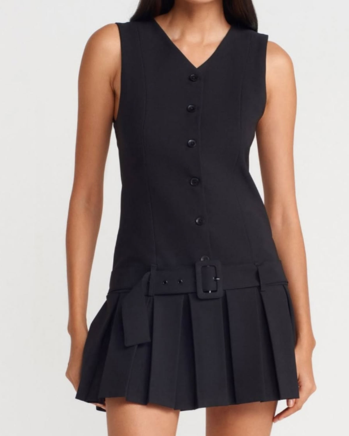 Siyah V Yaka Kolsuz Kemerli Mini Elbise