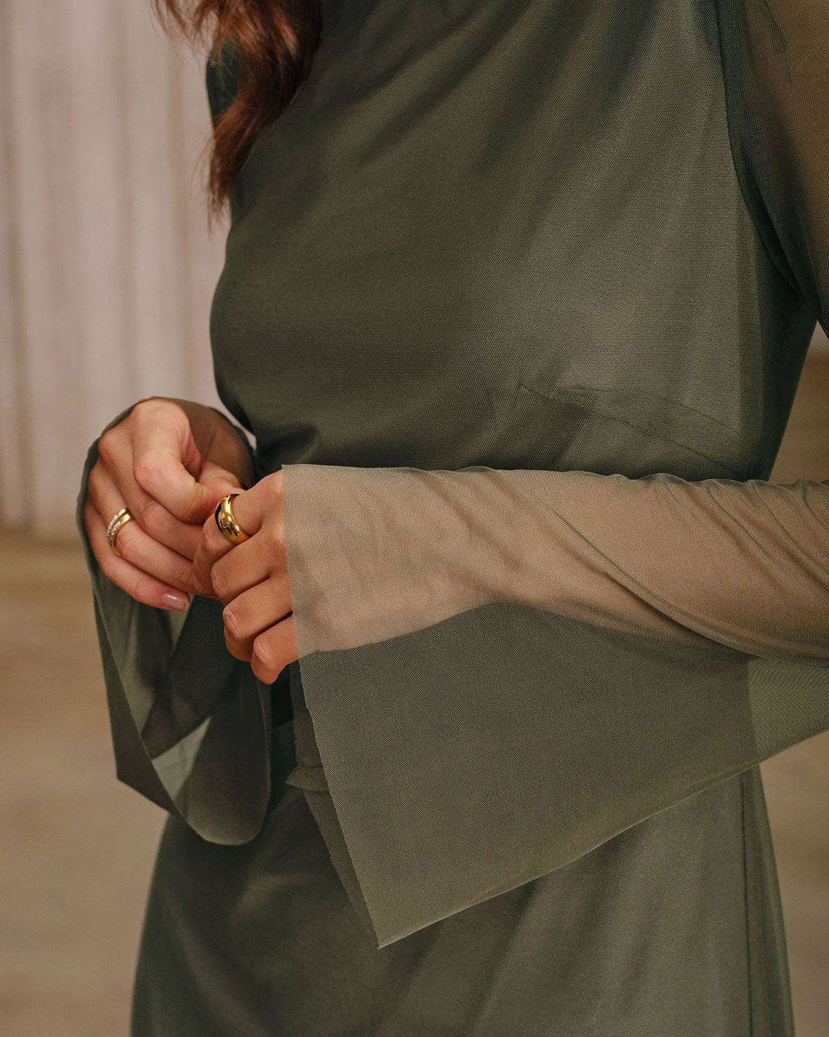 Yeşil A Kesim Uzun Kollu Mini Elbise
