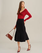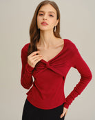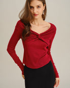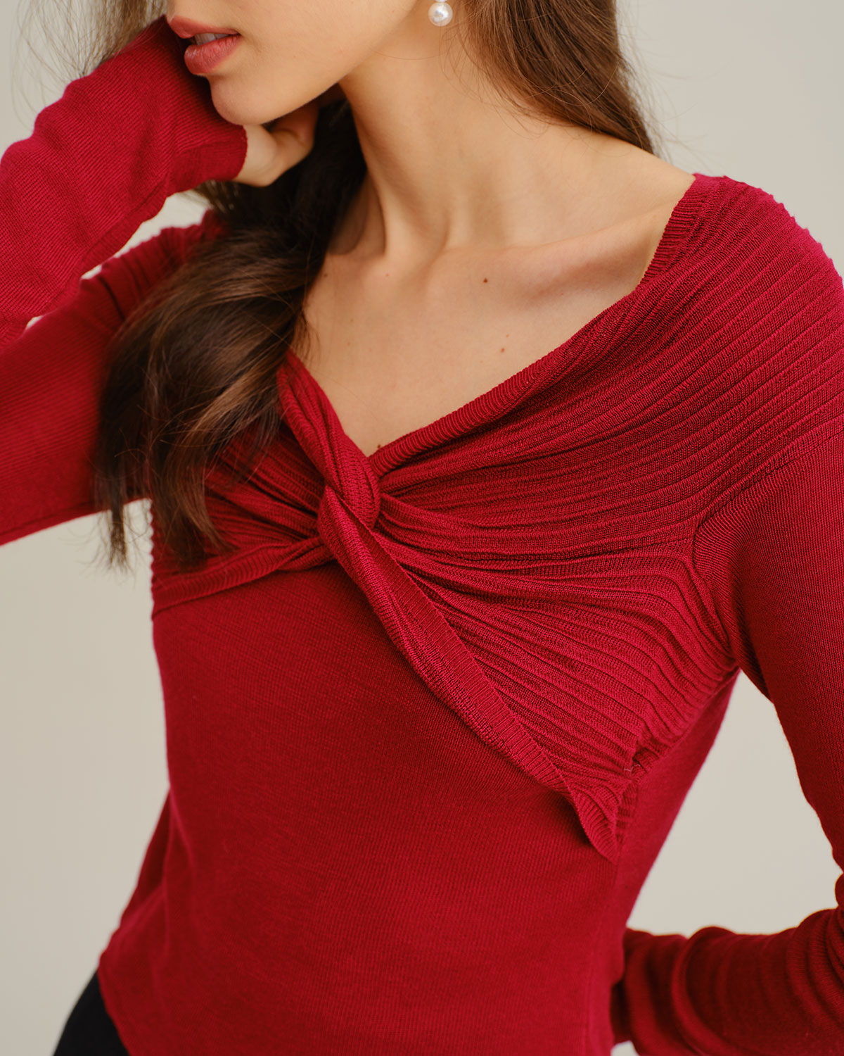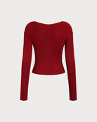 Kırmızı V Yaka Bükülmüş Örgü Tişört