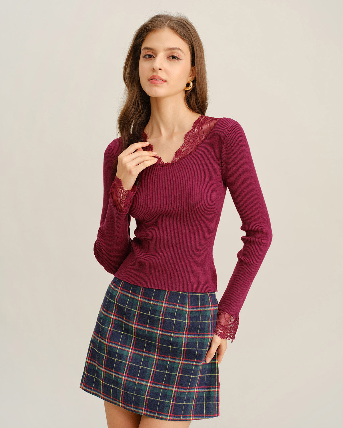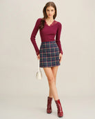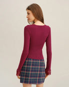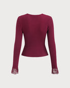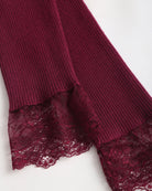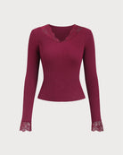 Şarap Kırmızısı V Yakalı Kaburga Örgü Tişört