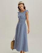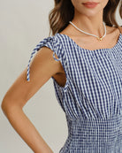 Mavi Ekose Tekne Yaka Büzgülü Midi Elbise
