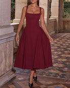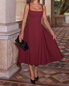 Kırmızı Kare Yaka A Kesim Midi Elbise