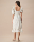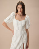 Belltoile™ Bej Puf Kol Çizgili Yarma Pamuk Midi Elbise