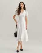 Beyaz Kabarık Kollu V Yaka Midi Elbise