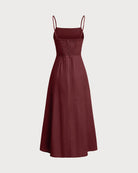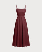 Şarap Kırmızısı Kare Yaka Büzgülü Midi Elbise